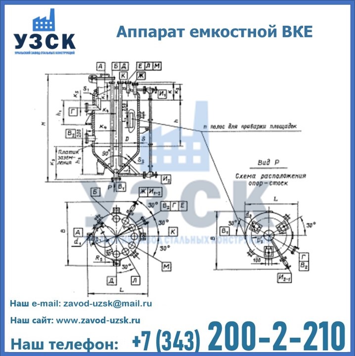 Емкостные аппараты ВКЭ представляют емкость с эллиптической крышей и коническим днищем. аппарат может использоваться в Казани для приема и хранения жидкостей и взрыво- и пожароопасных веществ. Создаваемое давление не должно превышать 0,6; 1,0 МПа. Емкости ВКЭ выполняются как цельносварные. Используется марка стали, отвечающая степени агрессивности продукта и температуре эксплуатации.